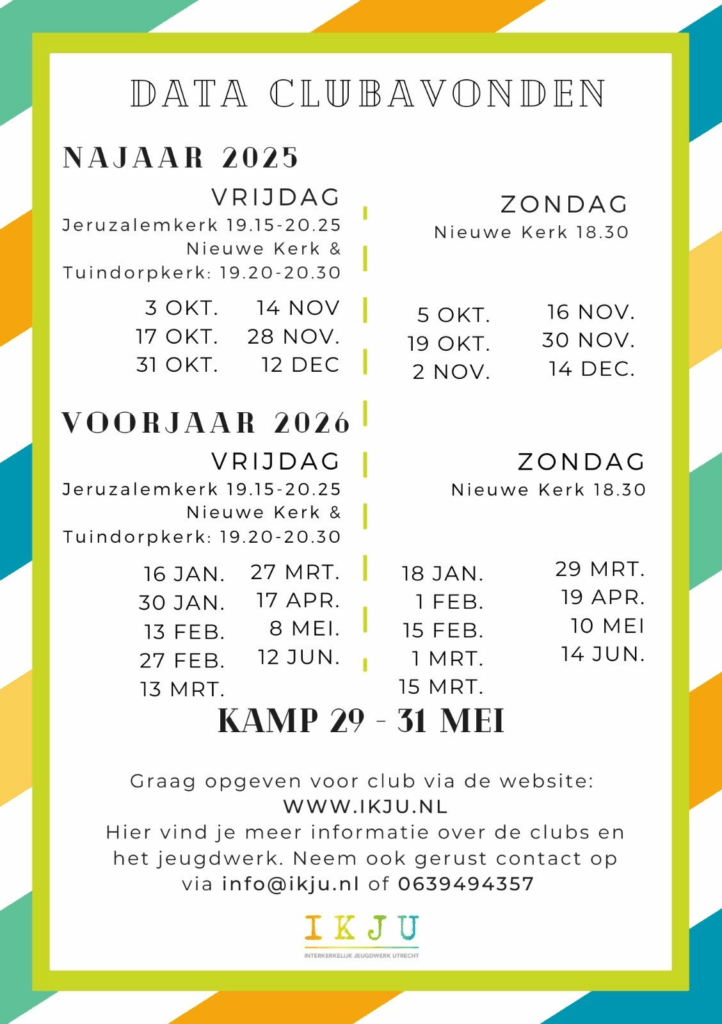 Hieronder vind je de algemene informatie over de clubactiviteiten. Er kan nog wel eens wat veranderen. Je kunt ook altijd voor de zekerheid contact met het IKJU opnemen.